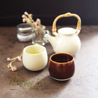 なつめの実のころんとした形状をモチーフにデザインされました。手で包み込みたくなるようなこのシルエットは、木の実のようなかわいらしさのある雰囲気。色展開は2色で、アメ色と白色があります。土瓶も湯呑みも下の方に釉薬の塗り分け線が見えているのが、ツートンカラーの様でそこもまたかわいらしいシリーズです。