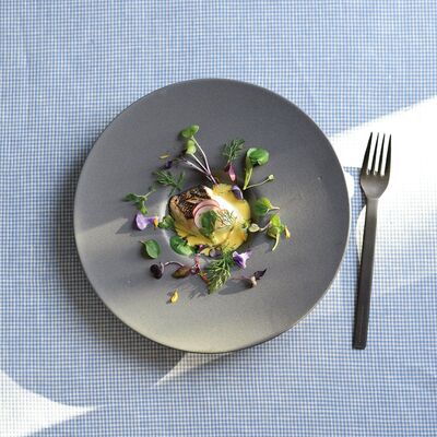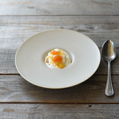 「テゾーロ」はイタリア語で宝物。前菜やデザートなど特別な一皿が食事をする人たちと出会う時、刻まれる記憶が宝物となる。そんなテゾーロリムプレート。広いリムと中央の小さなくぼみが特徴的で、両者をクリエイティブに使い、シェフの思いのこもった一皿に、ストーリー性のある演出をほどこす。やわらかなカーブ形状のくぼみには、アイスクリームやソースなどを美しく盛り付けることが可能。丈夫な磁器素材と雰囲気のあるマットな釉薬の組み合わせでニュアンスと動きを付けた唯一無二の魅力で、器もまた思い出の食事の演出に貢献する。