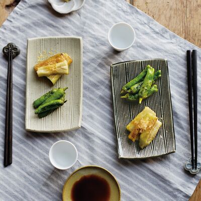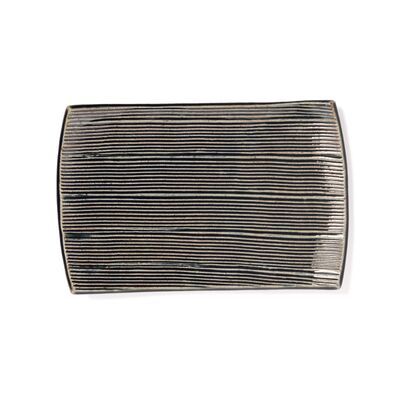 「かしわで(膳)」とは料理をのせる台や食事のこと(太古の昔かしわの葉をお皿代わりにしたことから)。古風な素朴さを表現する「かしわで」焼き物皿は、たたら成形で作った皿に4つの脚を付け土原型とした、揺らぎのある角皿。反りのある盛面に櫛目を施し、現れた趣深い釉だまりや焦げと手触り。黄土の陶器素材による温もり。裏印にはかしわの葉モチーフの可愛いロゴが。青磁と濃藍の2色。透明度のある釉薬を使用し土の表情が透け、素朴さや荒々しさのある質感が完成。お酒に合う洋風のおかずを盛付けても不思議と馴染みますよ。