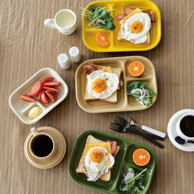 メインのおかずにサラダやフルーツ、ソースなど、仕切られたプレートに一度に盛り付けができ、手早さが求められる食事の準備も楽しい器です。