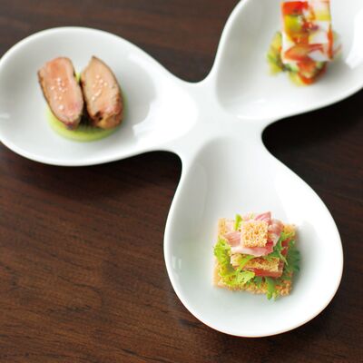 3つのボリュームで形成された、植物を連想させるオーガニックなイメージの器。エッジ部分は薄く、繊細な仕上げになっているため、エレガントさもあります。レンゲやガラスの器を組み合わせてみたり、2枚をずらして重ねてみたりと、盛り付ける人の想像力を駆り立てるこの器は、カジュアル、フォーマルを選ばず、食卓を華やかに演出してくれます。
