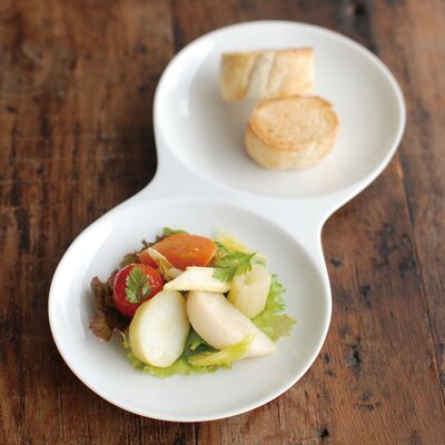 デュボルテはイタリア語で「2枚の葉」という意味。プレーンな丸い皿をつなげたような変形プレートです。メガネを形取ったような丸みのあるデザインですが、高さを極力低くし、エッジを適度に立たせてあるためシャープな印象を与えます。単に2種類の料理を盛り込むだけではなく、片方にカップ、片方にデザート、といったように多くのスタイルに対応でき、汎用性に長けています。