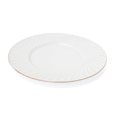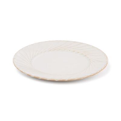 リムの波打った凸凹のレリーフが美しい、デコラティブな少しアンティーク調のプレート。素材は陶器で、粉引のやわらかい白色がなんとも優しく、花のような印象を与えます。