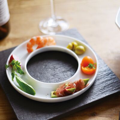 チャンベッラはイタリア語でドーナツという意味。細長いトレーが丸くつながったような変形プレートです。前菜やデザートを盛り付けることによって料理が連続する面白さを演出することができ、ドーナツのような見た目と合わせて、小さなスペースでもテーブルを印象的なものにします。真ん中にボールなどを組み合わせてセパレートタイプの器のように使うこともできます。