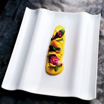 ごちそうという意味があるパッキア。紙を一枚たわませたようなフォルムはボリューム感があり、盛り面も大きくとることができるので、料理をより引き立ててくれます。両端にある溝には、カトラリーを置いたりソースを入れることができ動きもあるので、パーティーシーンにもぴったりです。