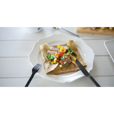 花のようなリムが特徴のレトロな印象の器。色の展開も豊富なので、組み合わせを選ぶ楽しみもあります。10”プレートはメインプレートとして、8"プレートはデザートにぴったりです。