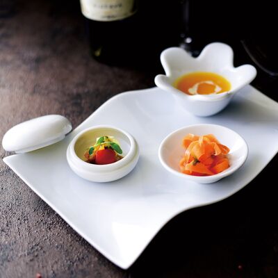 高くなったり低くなったり、まるで波のような「モンテ11″プレート」。珍しい不思議な形をしていますが、料理をのせる部分はフラットな形状にされているので盛りやすく、小物を組み合わせることもできます。目にも美しく、大切な記念日やおもてなしの日に使っていただける、テーブルを彩る特別な一枚です。