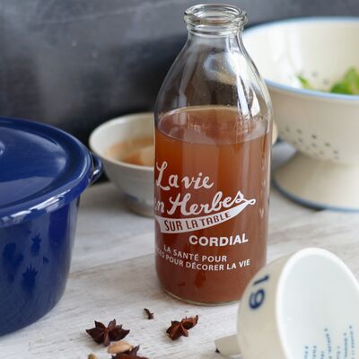牛乳瓶に大胆に配したプリントロゴが、ヴィンテージぽさのあるデザインです。ハーブやフルーツのコーディアルをストックしたり、普通に水やお茶を入れても新鮮な印象です。