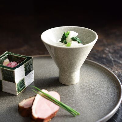トロンバとはイタリア語でトランペットの意味。その名の通り、高台が高く口元が広がっている形状で、小鉢や酒器として使えます。平鉢よりも盛りつけが簡単で、和え物を中央に置くだけで盛り映えしますし、食卓に高さが出る事で特別感や高級感がより引き出される器です。和食器ですが磁器素材で扱いやすく、直線的でシャープなデザインのため、洋食器の風合いも感じられるので、和のシーンだけでなく洋のシーンでも違和感なく使えます