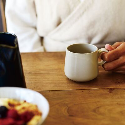 ココンはフランス語で「繭」を意味します。その名の通り、ふっくらと丸みのある愛らしいフォルムと、軽やかな素材感が魅力のシリーズです。スタイルを選ばない湯のみとして、日本茶や和紅茶、ハーブティーなど、みずみずしい香りを楽しむお茶の時間をイメージしています。飲み物だけでなく、デザートや副菜を盛り付けて小鉢としてもお使いいただけます。