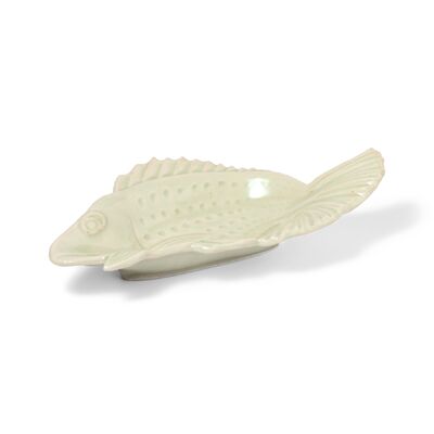 勢い良く今にも飛び跳ねそうな魚。魚が美味しいメキシコのフエダイがモチーフです。粘土で形作ることでヒレや魚のユーモアのある形を細かく表現できました。少し深さを出すことで汁気のある料理も盛り付けられます。爽やかな色合いのペスカードに副菜を盛り付けると、テーブルで泳いでいるような楽しげな雰囲気になります。