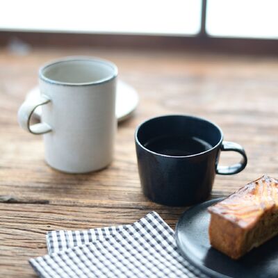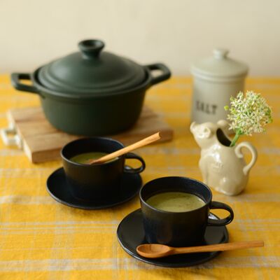 ブロウはフランス語で「白樺」という意味。表面が白樺のような表情をしていることから名付けられました。形を成型した後、手作業で表面を少し削ることで、削られた表面に焦げや釉ムラの表情が重なり、素朴で表情豊かな質感が生まれます。午後のゆったり流れるティータイムを、より穏やかな時間にしてくれます。