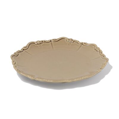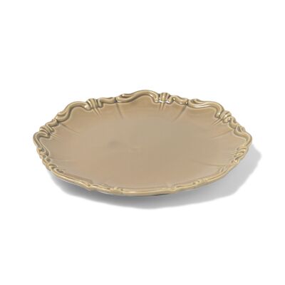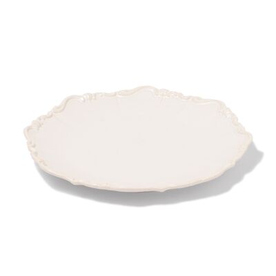 Attractive plate to make art of your cooking. Decorative relief patterns on the rim resembling plants and seashells will enhance any dish with art frame like effect. By using yellowish clay, its color is visible under the glaze on the raised parts of the decorated rim. This unevenness of the color creates antique-like nuances and enhances the delicate relief patterns. 245” plate is perfect for main dish, pasta, salad and great for parties to elegantly display a small size whole cake! Add special moments to your everyday table with Bijouterie.