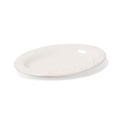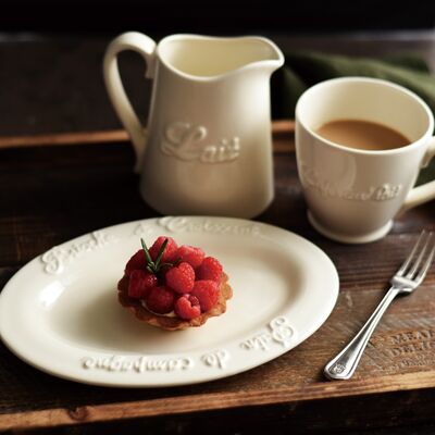 筆記体は手書きのデザインから。ポッテリとした厚み、凸文字と半磁器の柔らかな風合いが女性的な器です。ロングセラー商品で、スタジオ エムの25周年を記念してアメ色が登場しました。プレートLは、パンプレート、スイーツを食べるときにちょうどいい大きさ。オーバルの形と凸の文字がテーブルをお洒落にします。