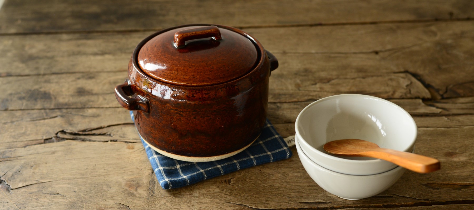 Why don't you boil delicious rice with an earthen pot? "Brais_" in French means to braise on a low heat. 16 Round Pot, featuring an adorable plump shape, is suitable for boiling rice measuring up to 2 "Go" [2 rice cups] (180cc X 2 = 360cc; about 150g x 2 = 300g). This earthen pot has a rim that is narrowed inward, which allows rice to be circulated very well and also reduces the chance of boiling over. We hope you will enjoy having soft and fluffy delicious rice.