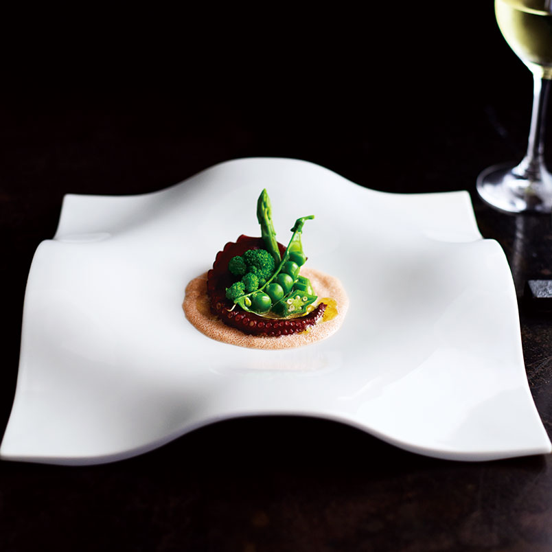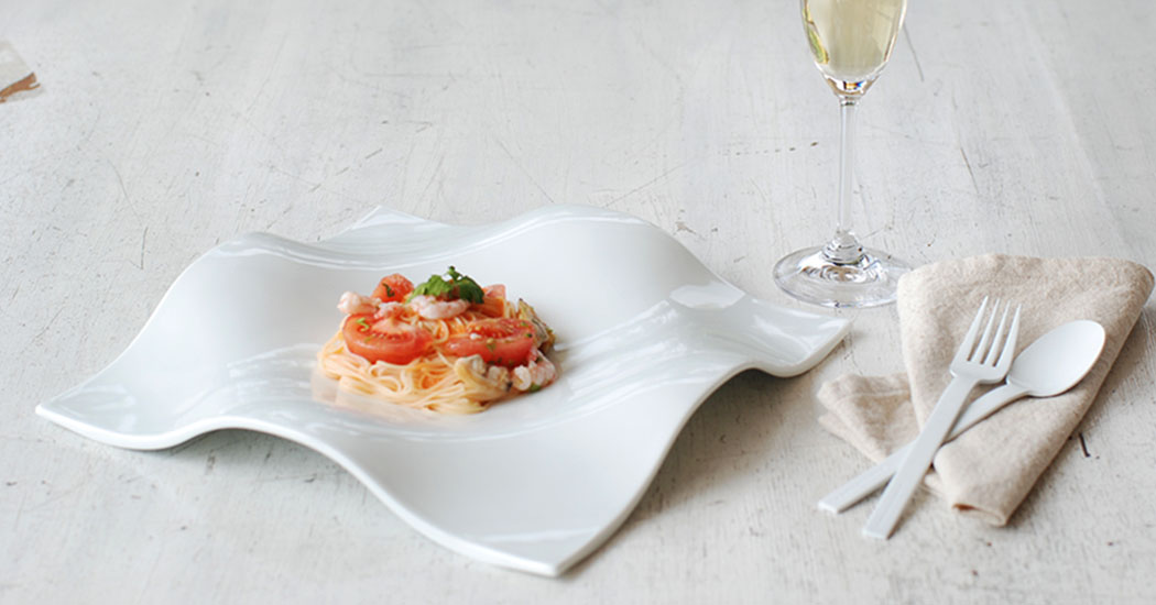 丘という意味を持つコリーナ。豊かな丘陵地の風景から生まれたプレート。左右対称のなだらかな高低さが優雅な陰影を生み出し、料理やテーブルを印象深く演出します。扱いにくい形に見えますが、凹凸部分を持ち手としてサーブできたり、スタッキングできたりと器としての機能性も持ち合わせています。盛り面も広めでくぼみもあるので、盛り付ける料理の幅も広がります。