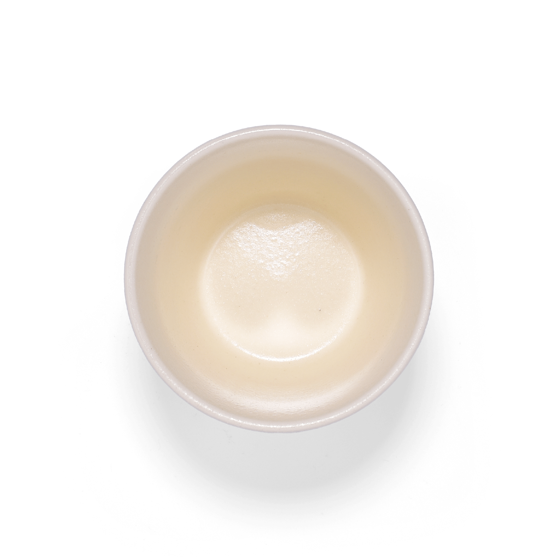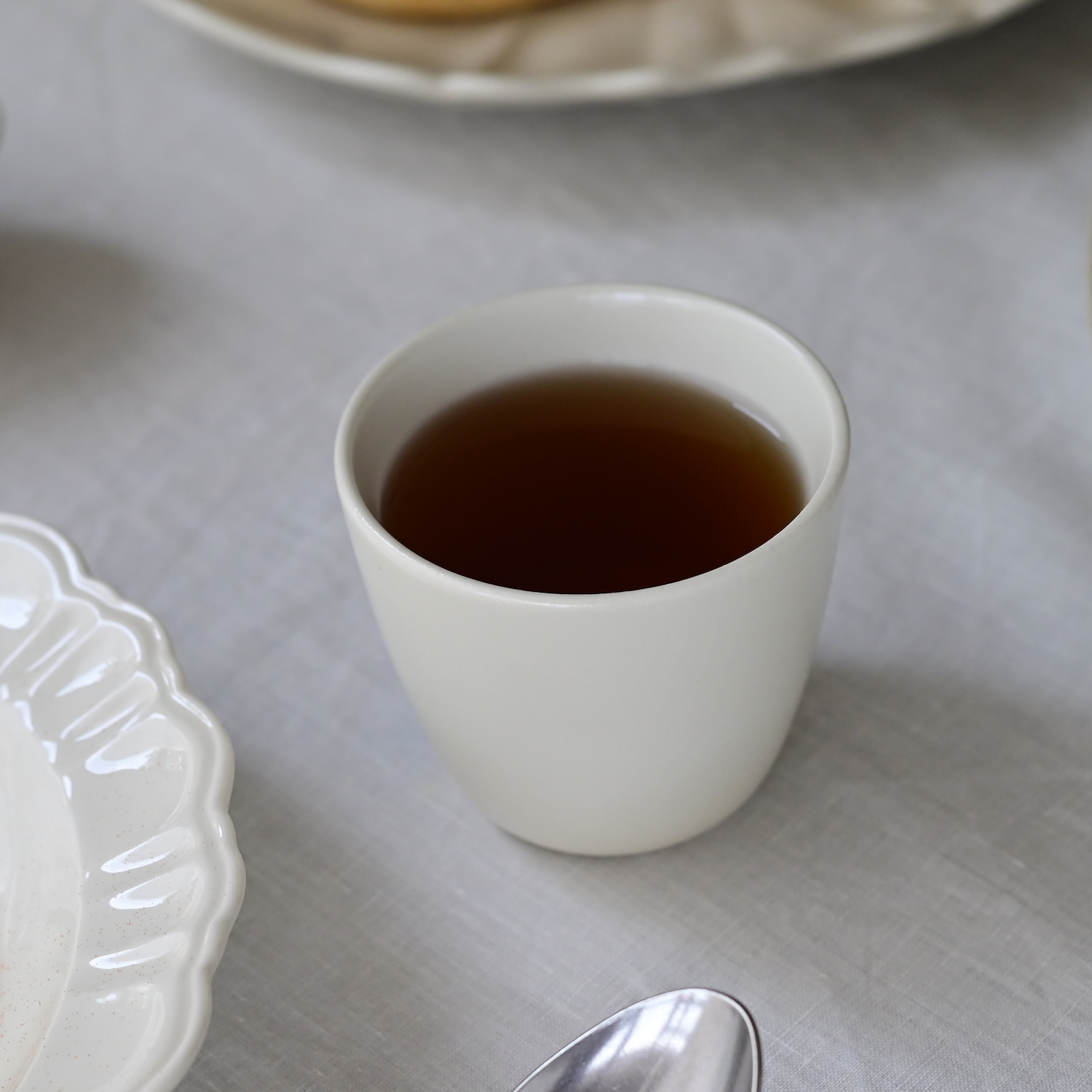 セミマットな質感と色が綺麗な釉薬が特徴の新しいパレット。スモーキーパープルとトルコグリーンは縁の色の薄い部分から、釉薬が溜まっている部分の色が濃いところまでのグラデーションが美しい色合いです。白もセミマット調にすることで奥行きのある白色になっています。ショートカップは飲み物はもちろんのこと、蕎麦猪口としてや、副菜やディップ入れにもご利用できます。