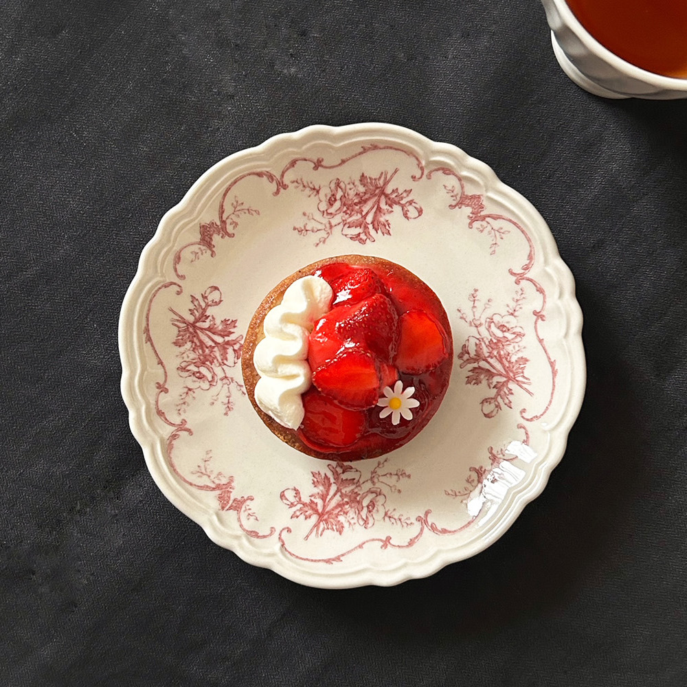 花が咲く季節の一瞬の美しさをイメージしてデザインしたフランス語で「ひと時」を表すモマンプレート。銅版絵付けで施した繊細な植物の絵柄がアンティーク調で心惹かれます。ソフトな雰囲気の「ブルー」と、ノスタルジーを感じさせる茶色味のある赤の「ロゼ」の2色は、どちらも表情豊かです。さらに、柔らかな縁取り装飾があるリムのない、少し深さのある形状は、使いやすく汎用性があります。モマン170プレートを取皿やお菓子用に使って、クラシカルなテーブル風景の中で楽しい食事のひと時を。