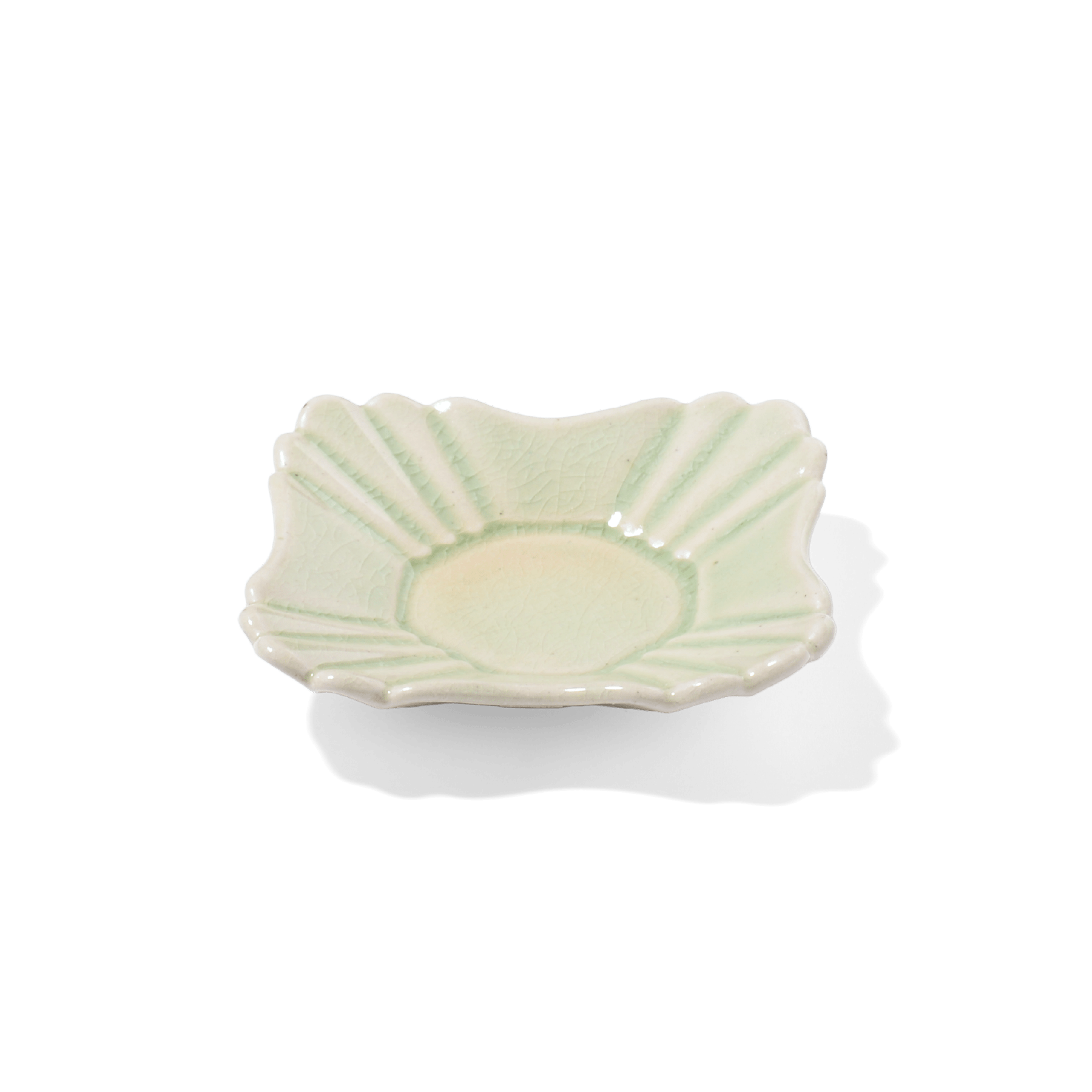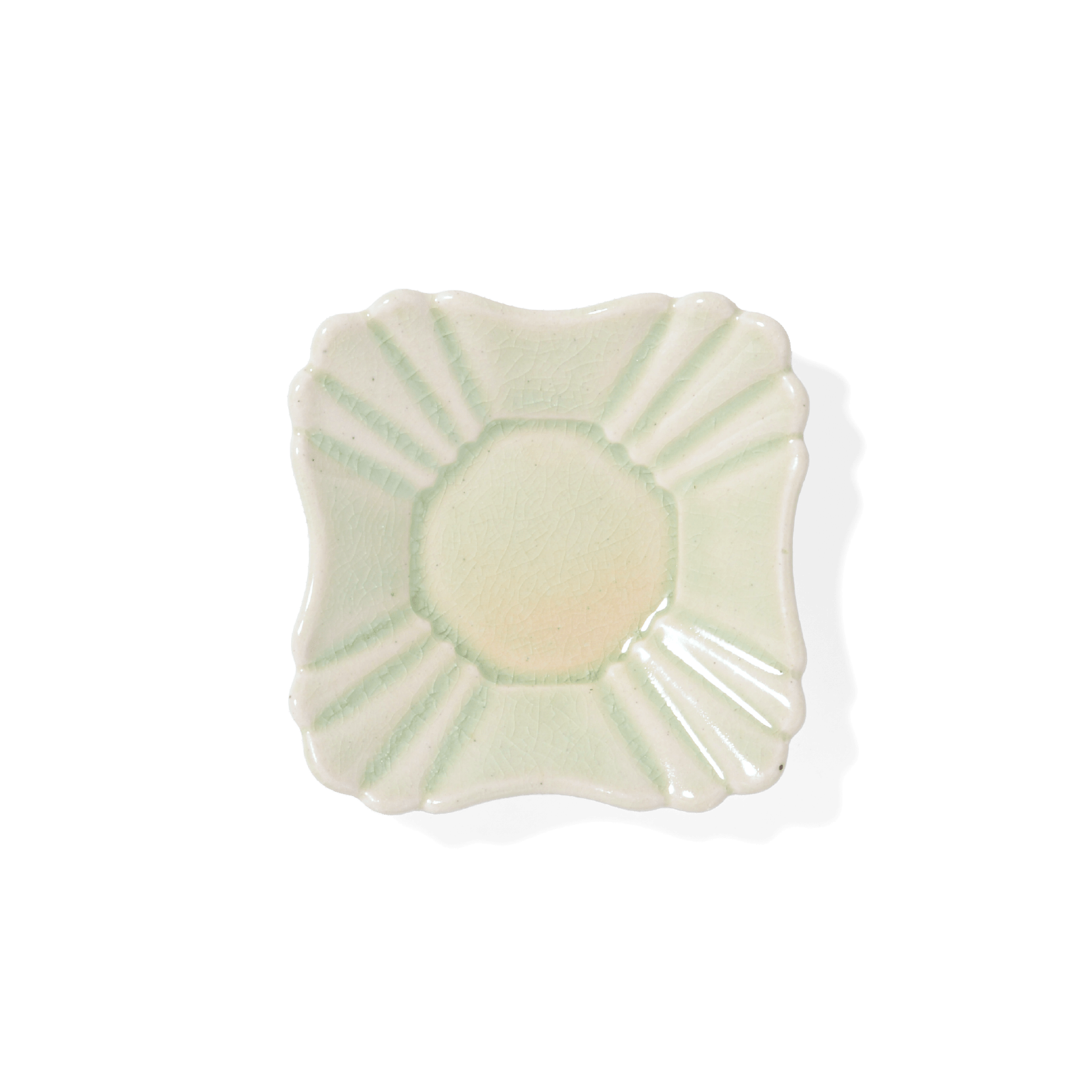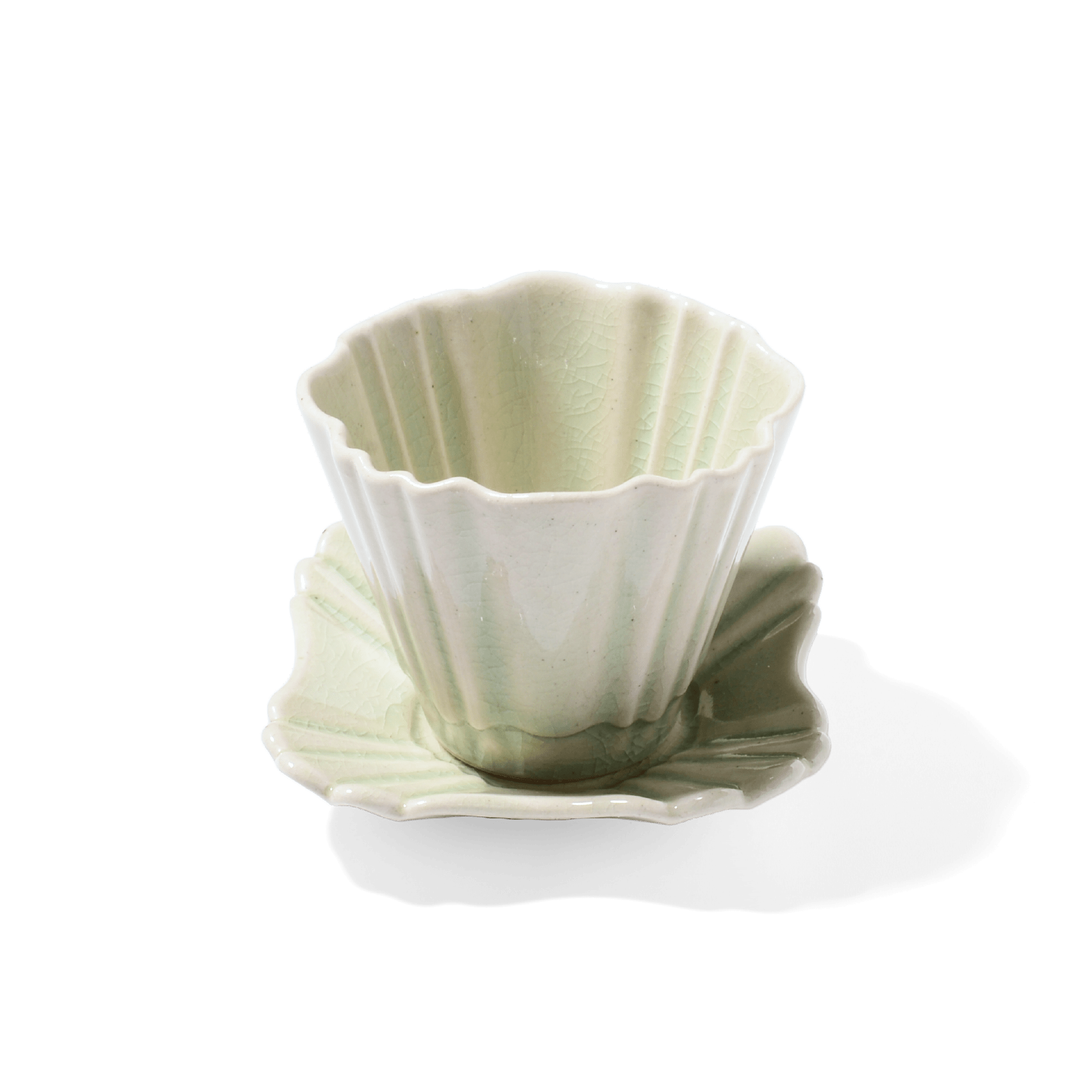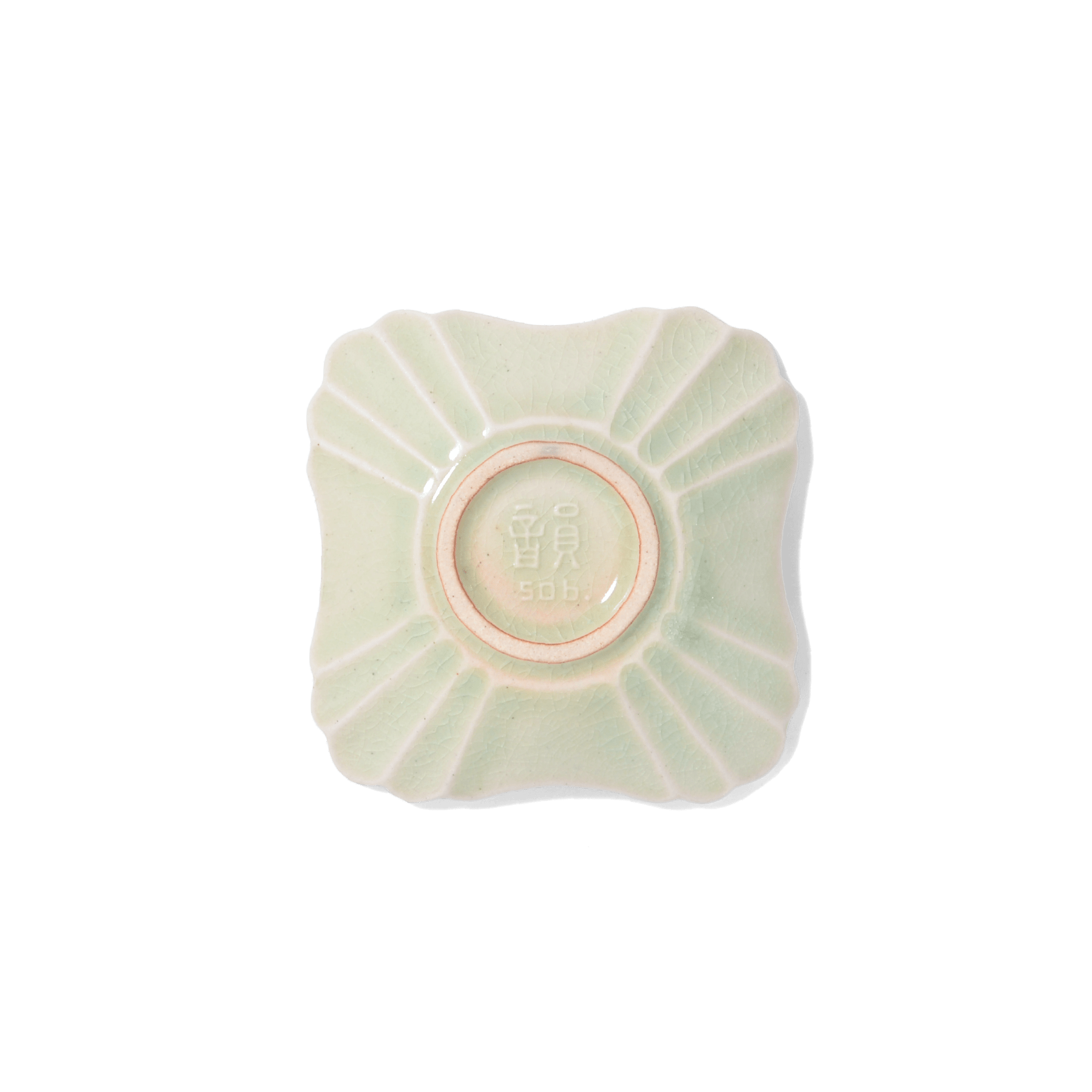 口径の丸い湯呑をすっきりとした印象にするため、茶托は連動した装飾線をつけながらも四角い形状にしています。コンパクトで収まりがよく、重ねた時もスペースを取らないサイズです。