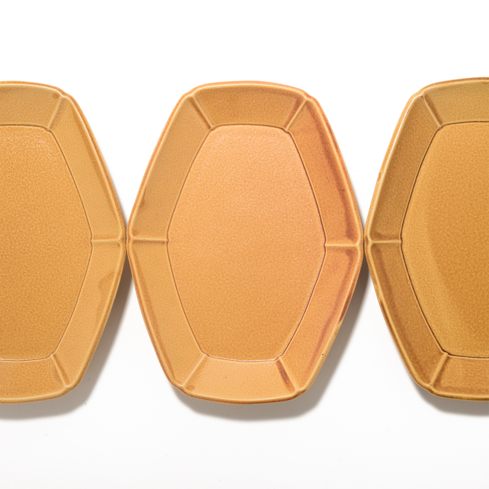 幅広いスタイルの食事に寄り添う、六角形の長角プレート。白土をベースに、左右非対称のゆらぎを取り入れたフォルムと色合いが、凛とした佇まいの中に素朴さを感じさせます。Lサイズは生姜焼き、餃子やフリットの盛り合わせなど銘々皿としても盛り鉢としてもお使いいただけます。