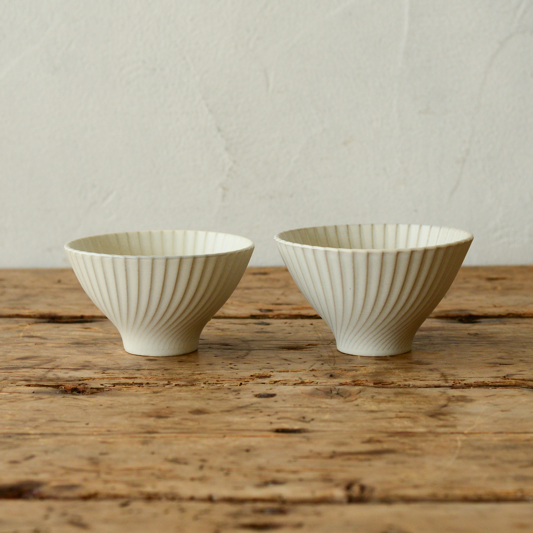 形状の歪みが目立つ場合があります。陶磁器は粘土から作られるため、成型後でも比較的やわらかい状態です。そのため乾燥させるときの気温や湿度などの自然条件により、商品ひとつひとつ形状が異る場合があります。