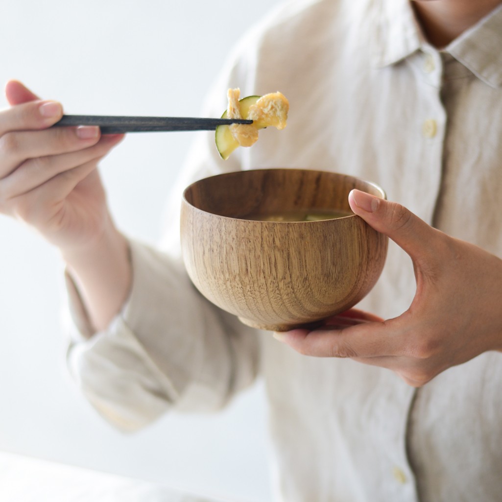 栗の木を一つひとつ丁寧にくり抜き、幾度も研磨を重ねて滑らかに仕上げた木のボウル。手にした瞬間に感じるやわらかな質感と軽やかさが魅力で、熱が伝わりにくいため、あたたかい汁物にも安心してお使いいただけます。使うほどに木目が深みを増し、味わいが育っていくのも楽しみのひとつです。サイズはLとSの展開。Lサイズは満水で約410cc入り、具沢山の味噌汁や豚汁にも十分な容量です。丸くおおらかなシルエットで、少し下膨れの、胴がふっくらとした形は豊かさや安心感、親しみやすい印象を受けます。食洗機対応でお手入れも簡単な、毎日の食卓に寄り添う器です