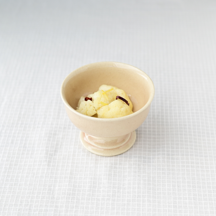 優しい印象の白土で仕上げ、表面に現れる美しい貫入が、シックで上品な佇まいを演出します。脚部には段差を施し、クラシックな趣を添えました。盛り付け部分はシンプルなボウル形状のため、お料理からお菓子まで、幅広くお使いいただけます。Sサイズは副菜にはもちろん、ワンスクープのアイスクリームにも可愛らしくお使いいただけます。