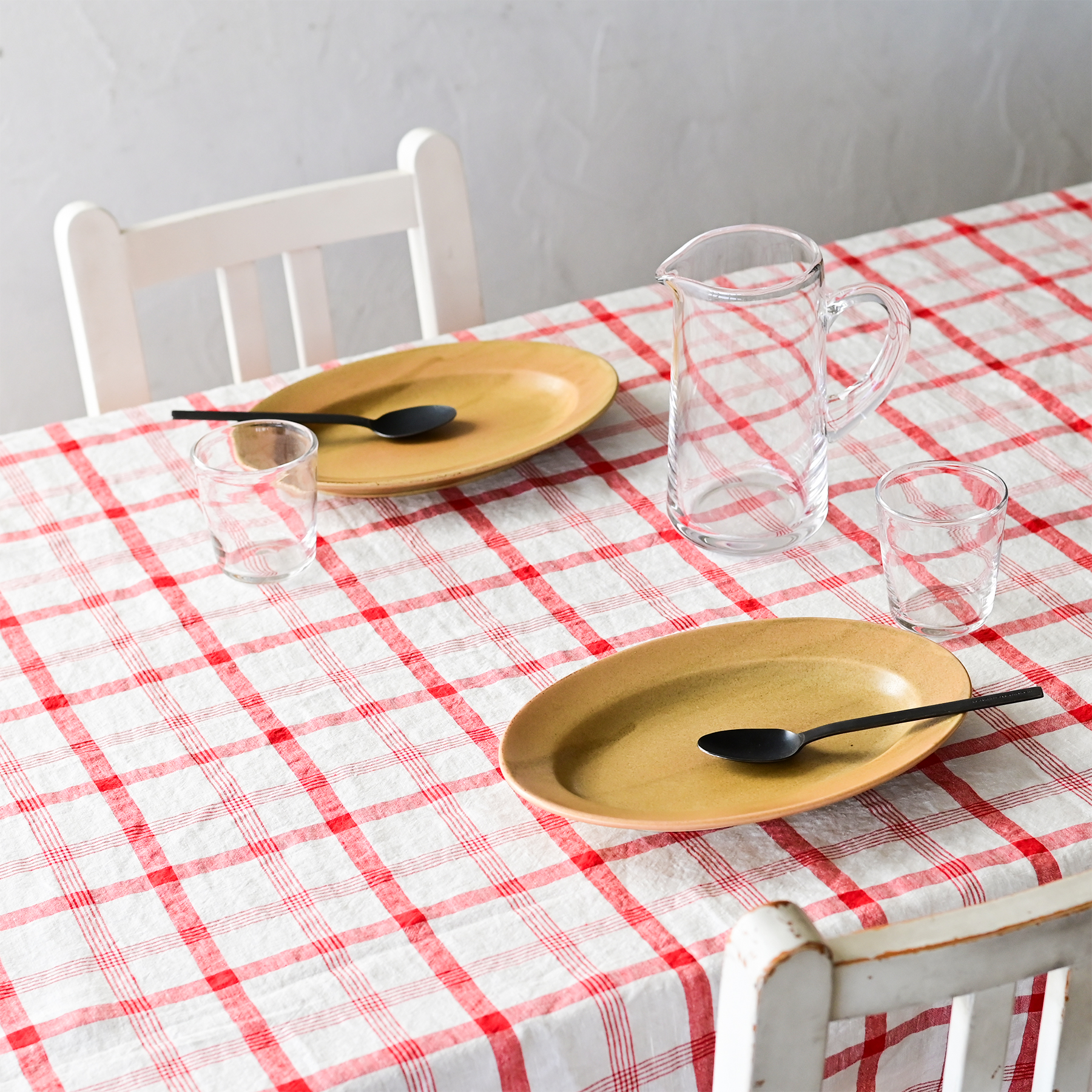 ・洗濯後は3%程縮みが生じます。・洗濯を繰り返すことで少しずつ色褪せて柔らかい風合いになります。・生地の使用部分によりチェック柄の位置が異なります。・タグのデザインが変更になる場合があります。・エプロンを洗濯の際は、洗濯ネットをご使用ください。・テーブルクロスは受注生産のため納品まで2-3週間かかる場合がございます。