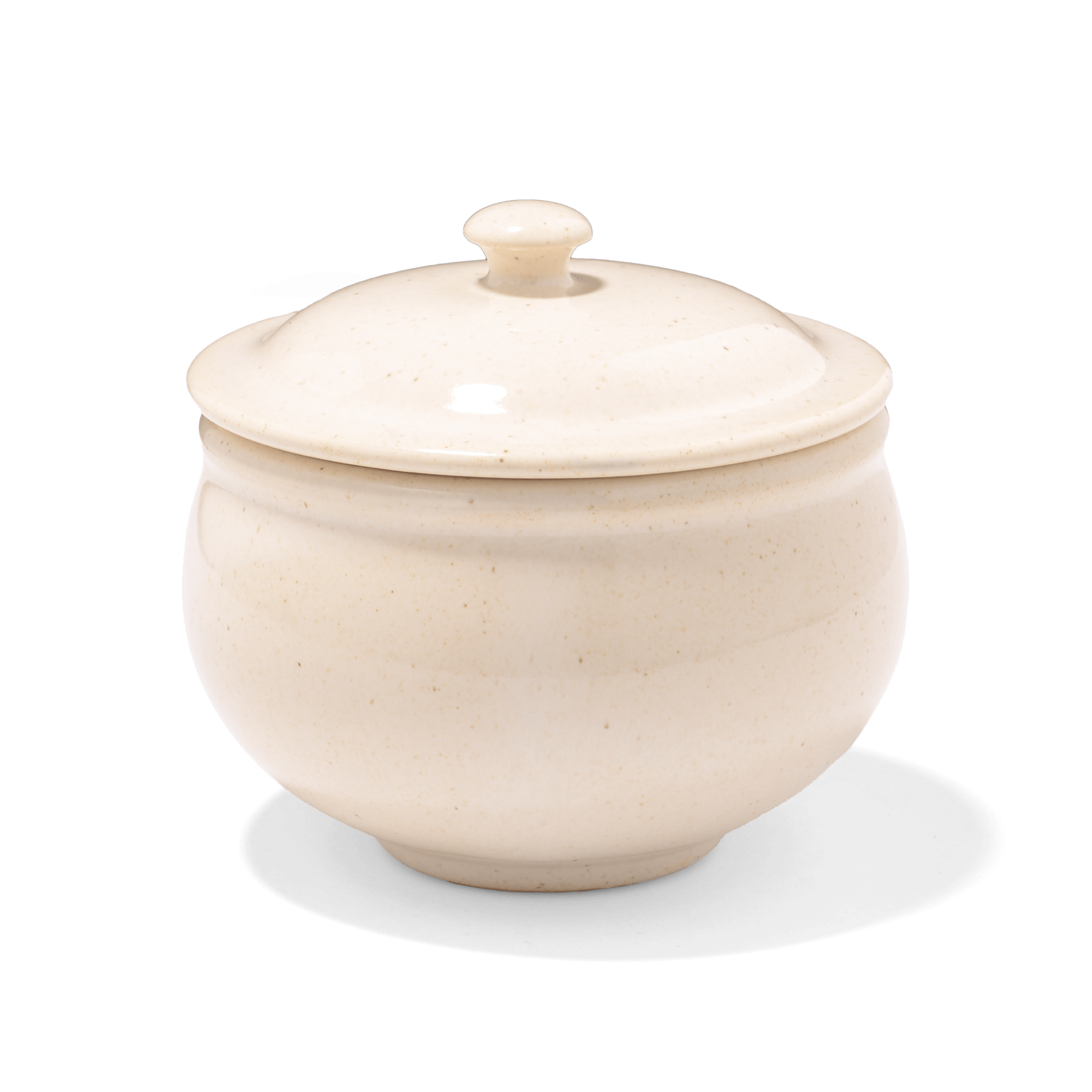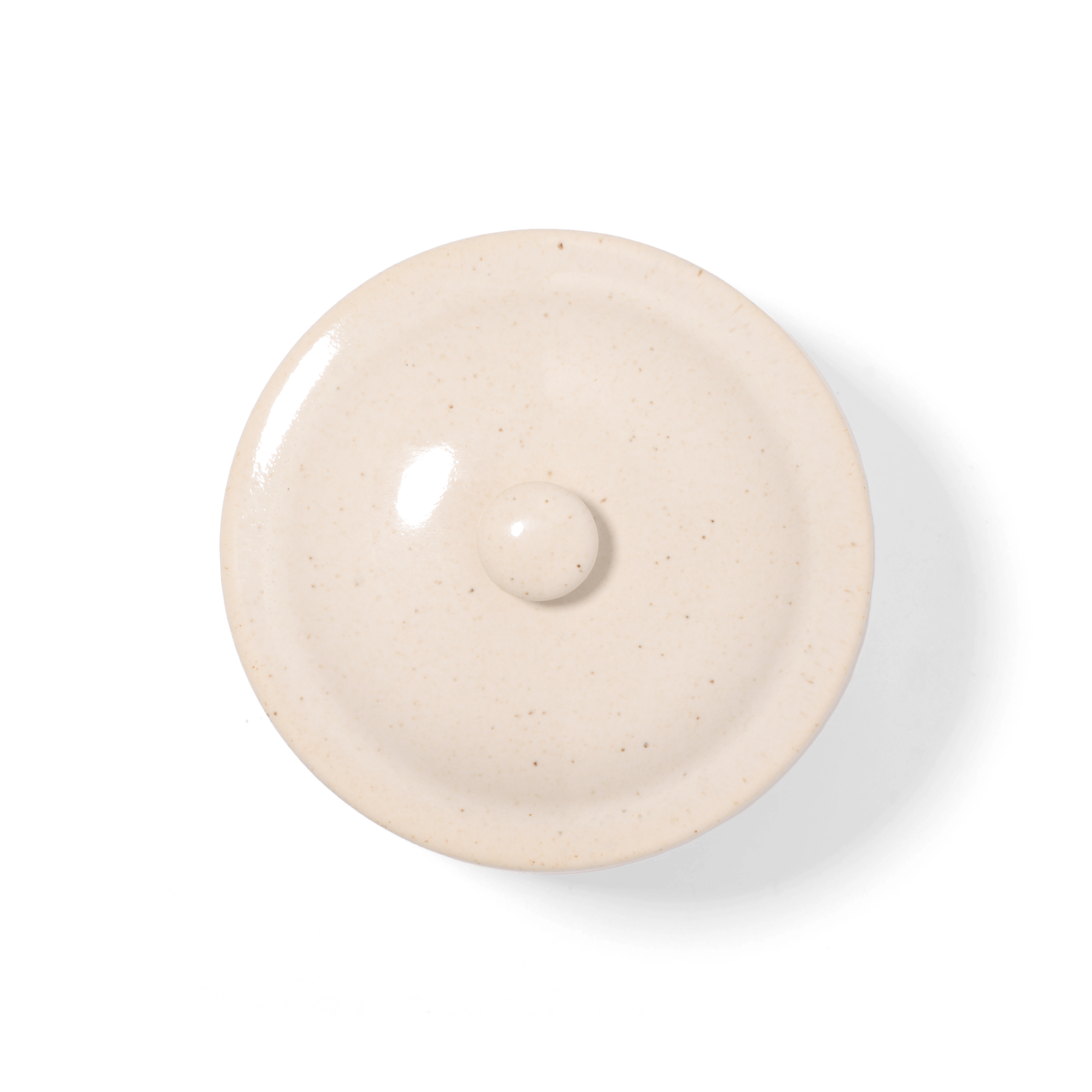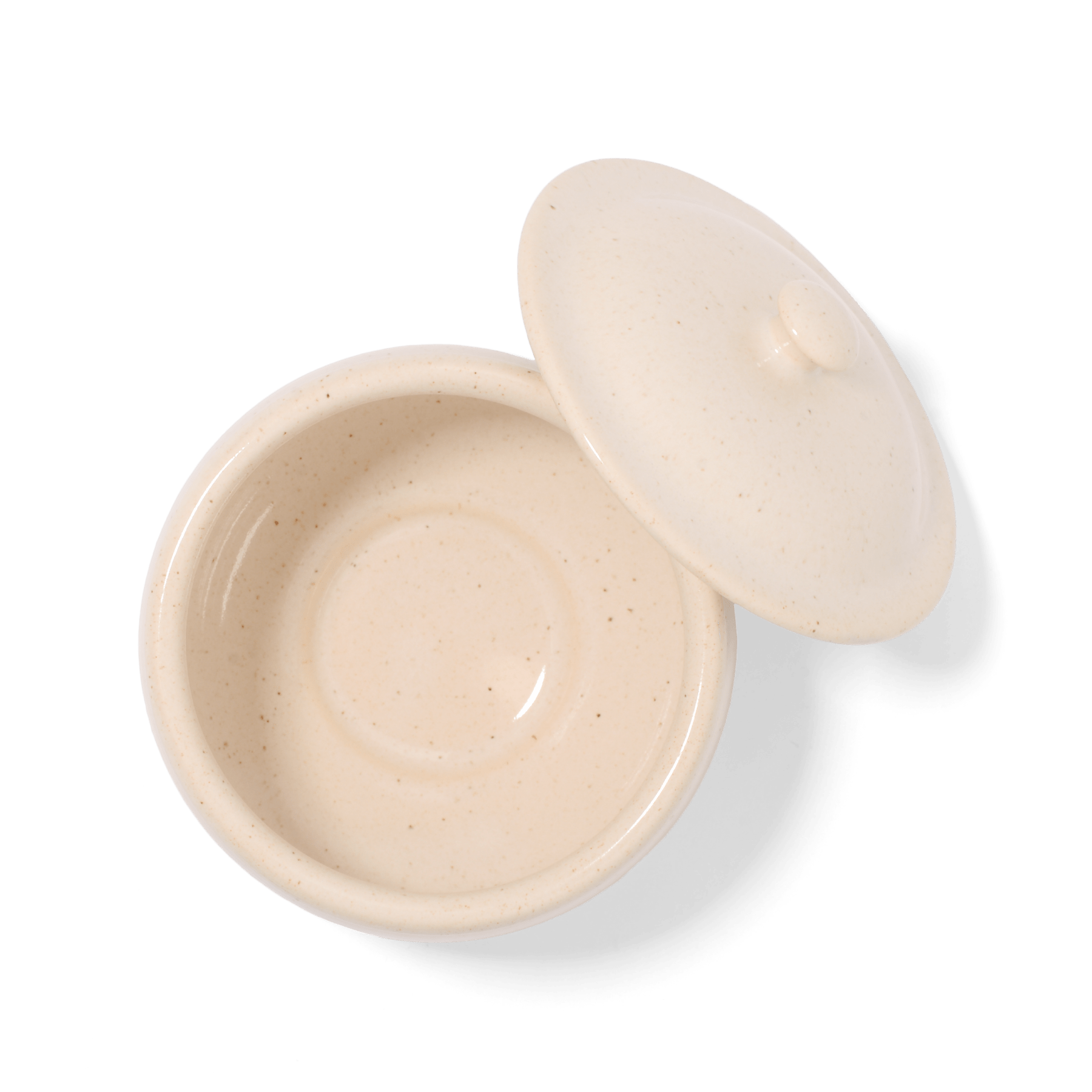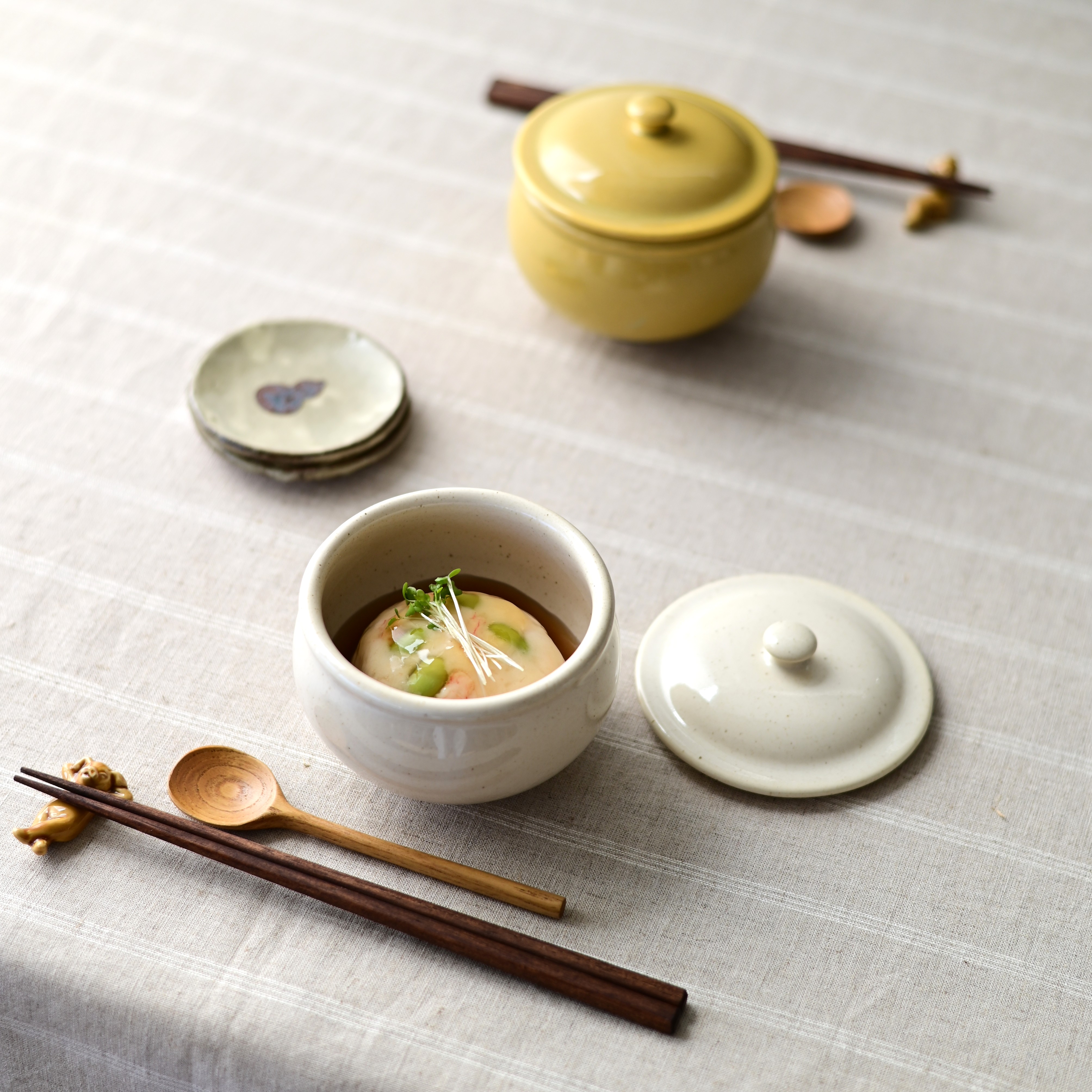 吸水性のない丈夫な磁器土で食材の保管等にも最適な素材で、玉縁部分や釉薬が薄くなった部分が少し焦げたり、鉄粉や斑入りの表情が特徴です。梅干し、佃煮、ちりめん山椒、大根菜とじゃこの手作りのふりかけを入れる容器としてだけでなく、飯器や蒸し物碗、蓮根まんじゅうや海老しんじょなど蓋付碗としても使えます。またテーブルやキッチンで使うキャニスターや、ティーバッグや個包装の飴や小菓子を入れたりにも使えるなど幅広い用途で使える器です。