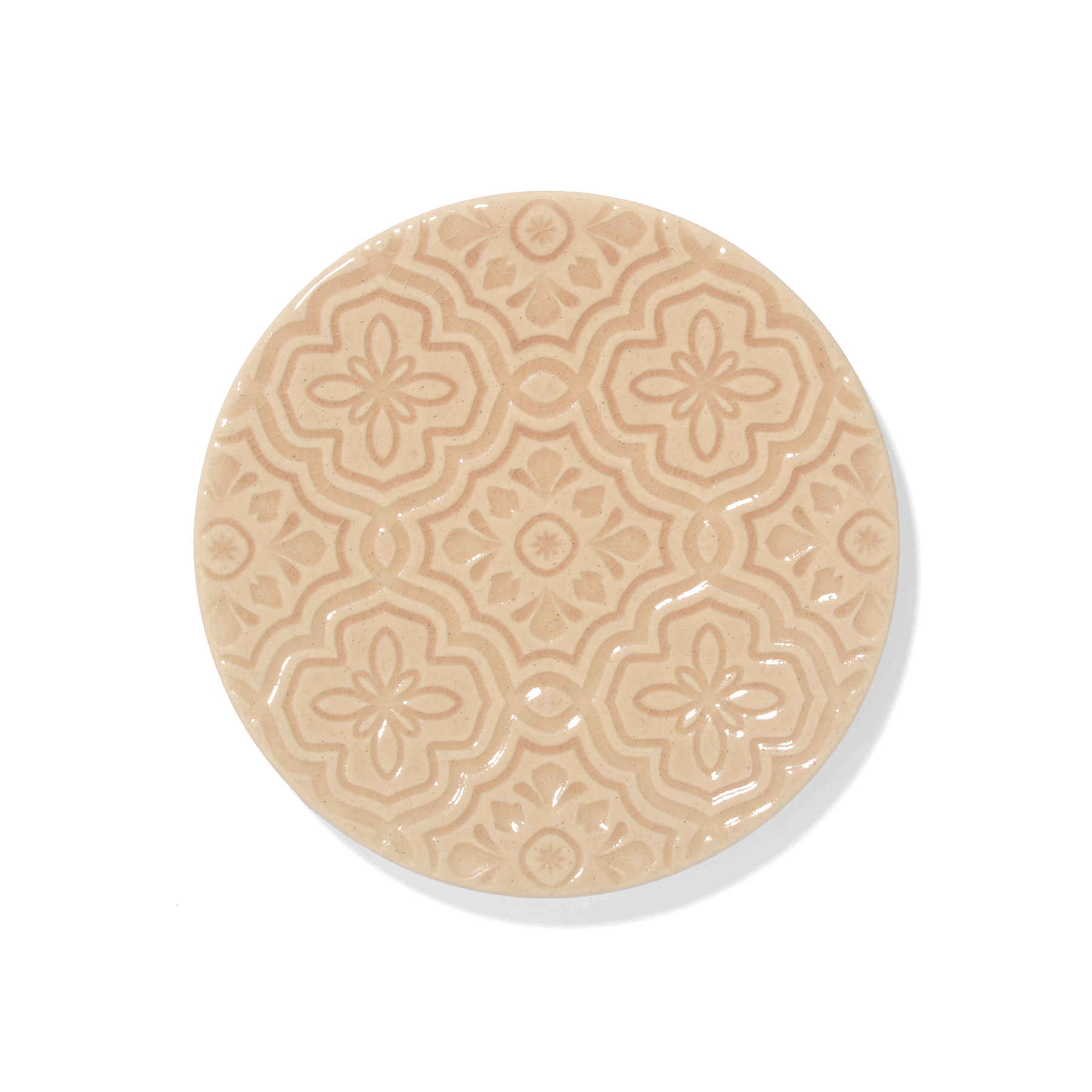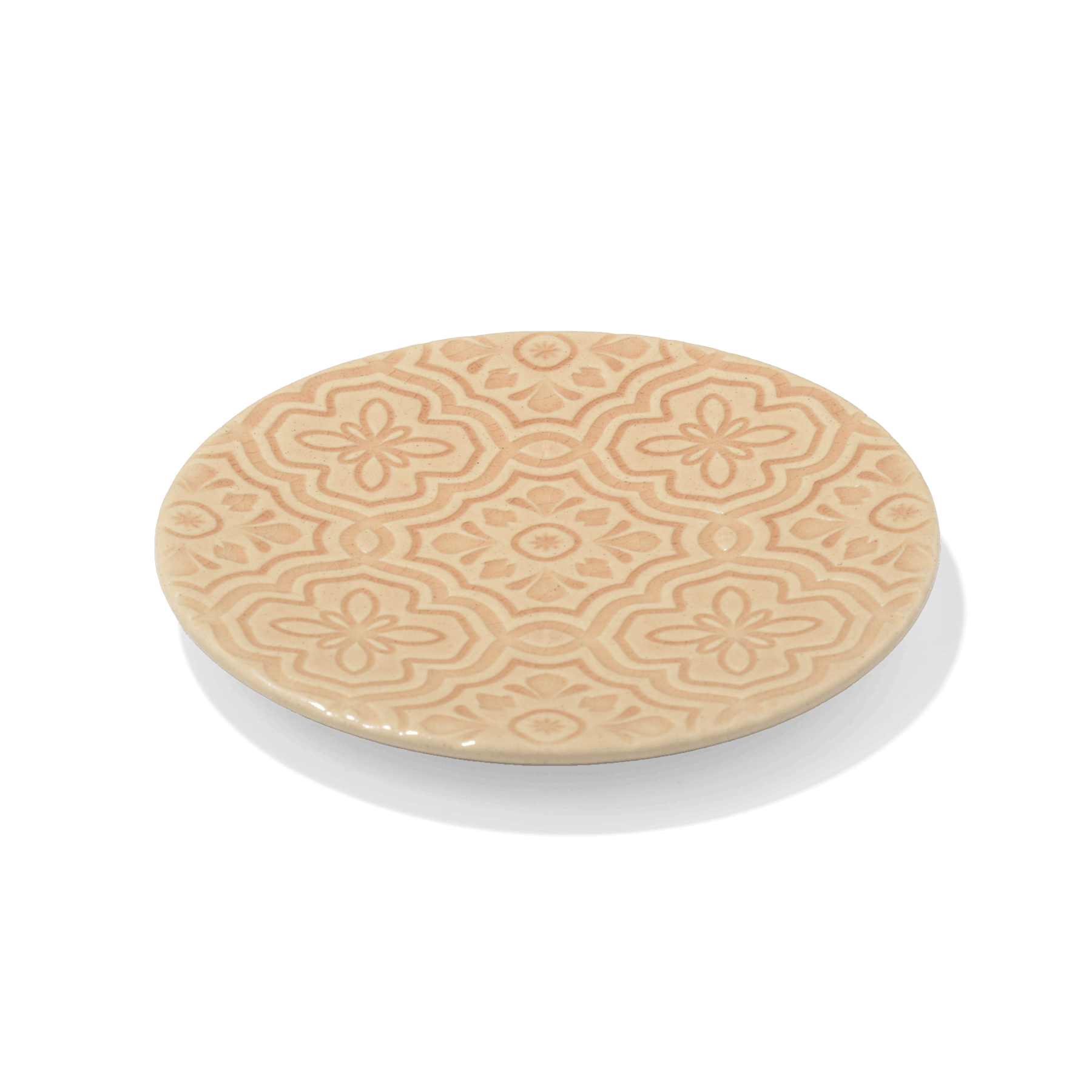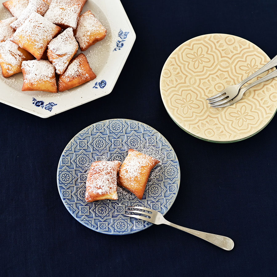 街の壁や床に散りばめられた色彩豊かなベトナムタイルをモチーフにデザインしたプレート。連続柄が浮かび上がる部分と釉薬がたまる部分の比率が美しくなるように線の太さや柄の大きさを考えました。大紋と小紋のそれぞれに、東南アジアの香りや空気感をイメージして選んだ色を合わせたところもこだわりです。生春巻きやサラダの取皿、菓子皿として、4色並べてカラフルな食卓をお楽しみください。