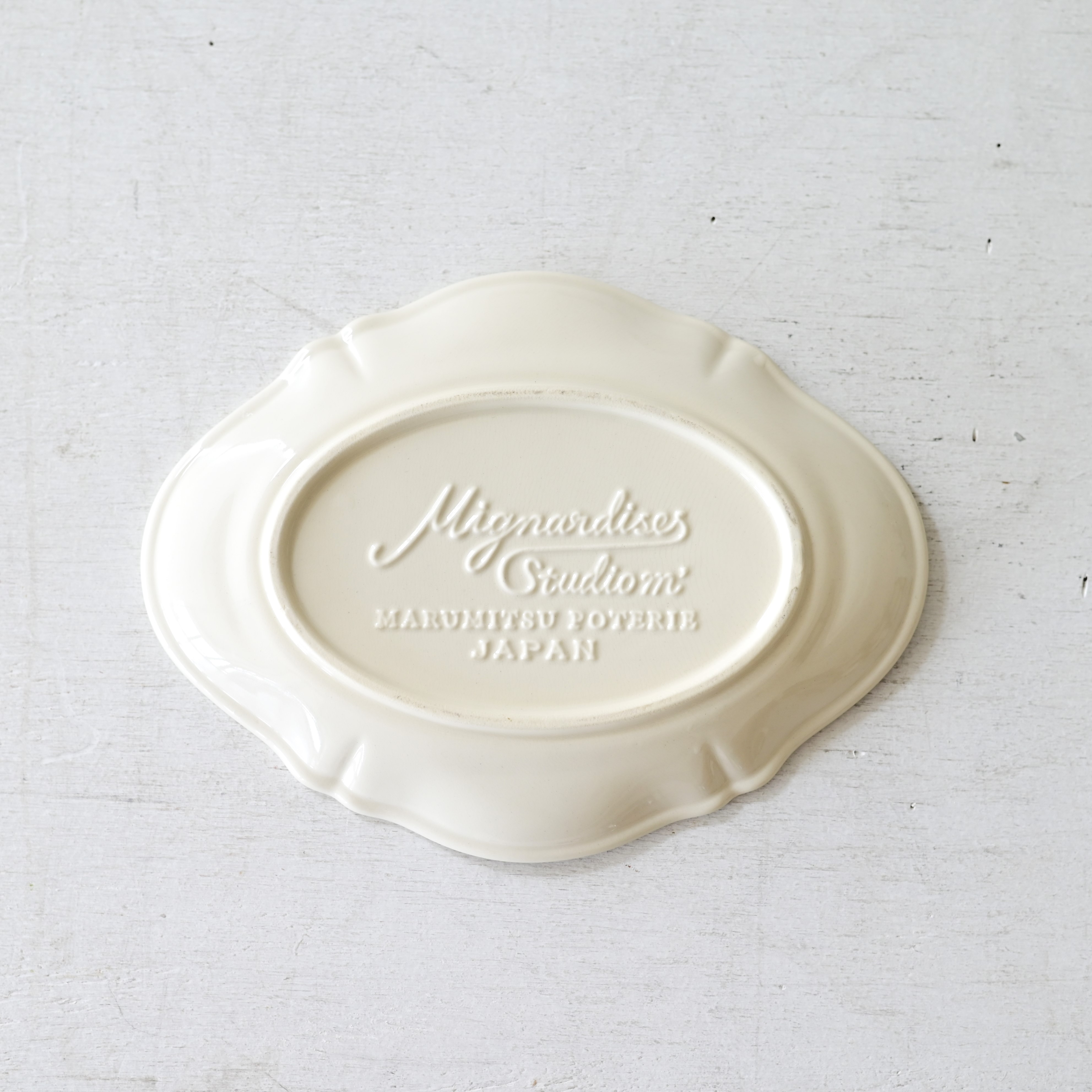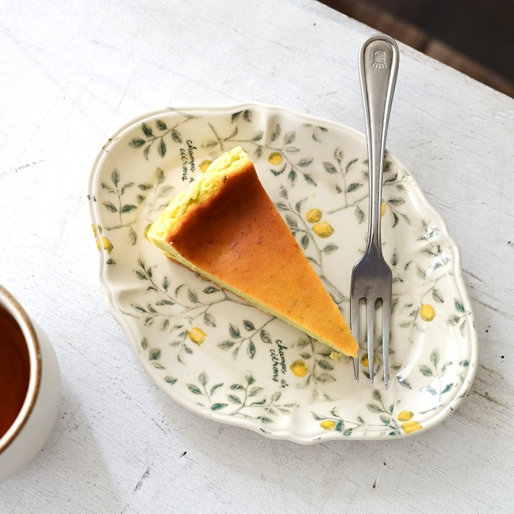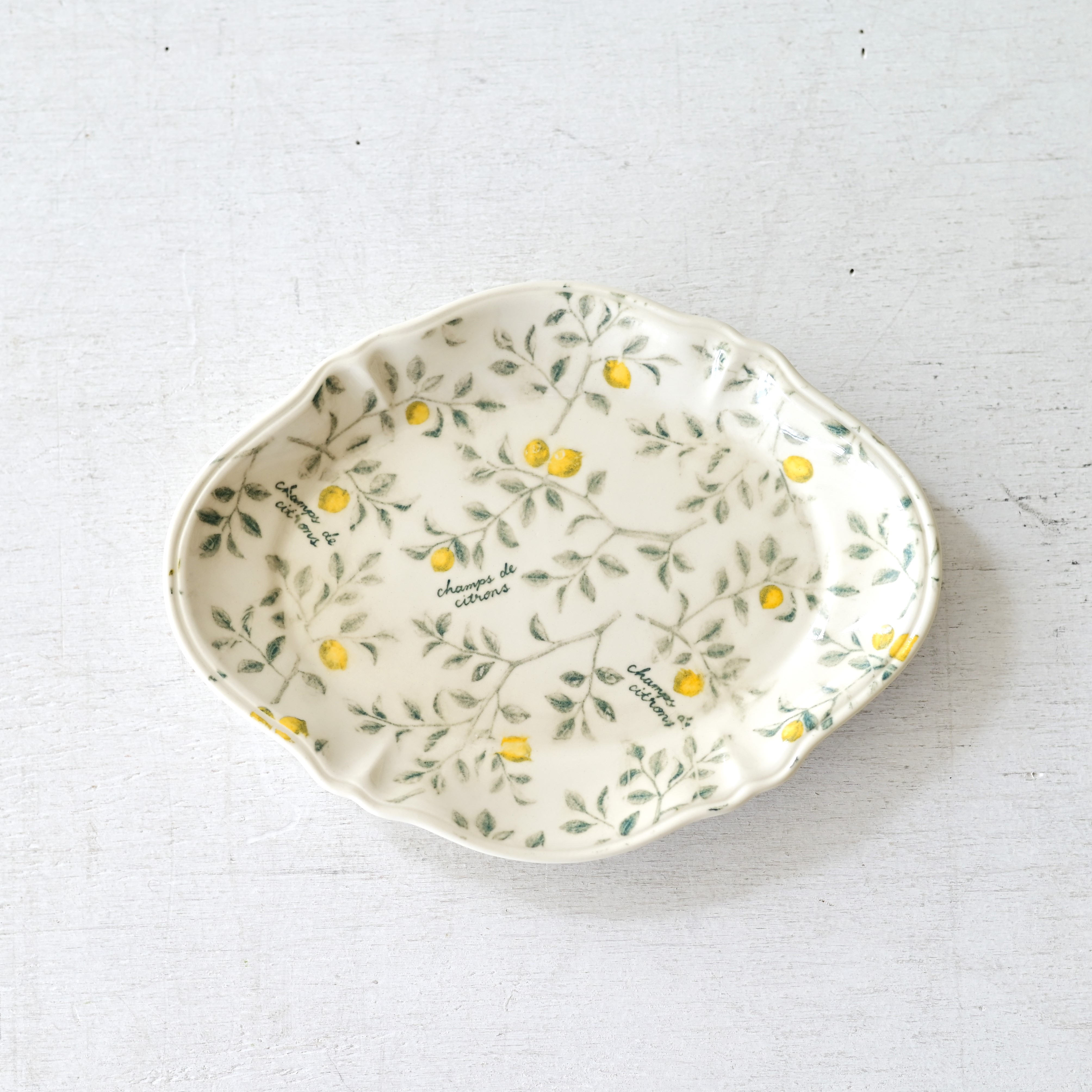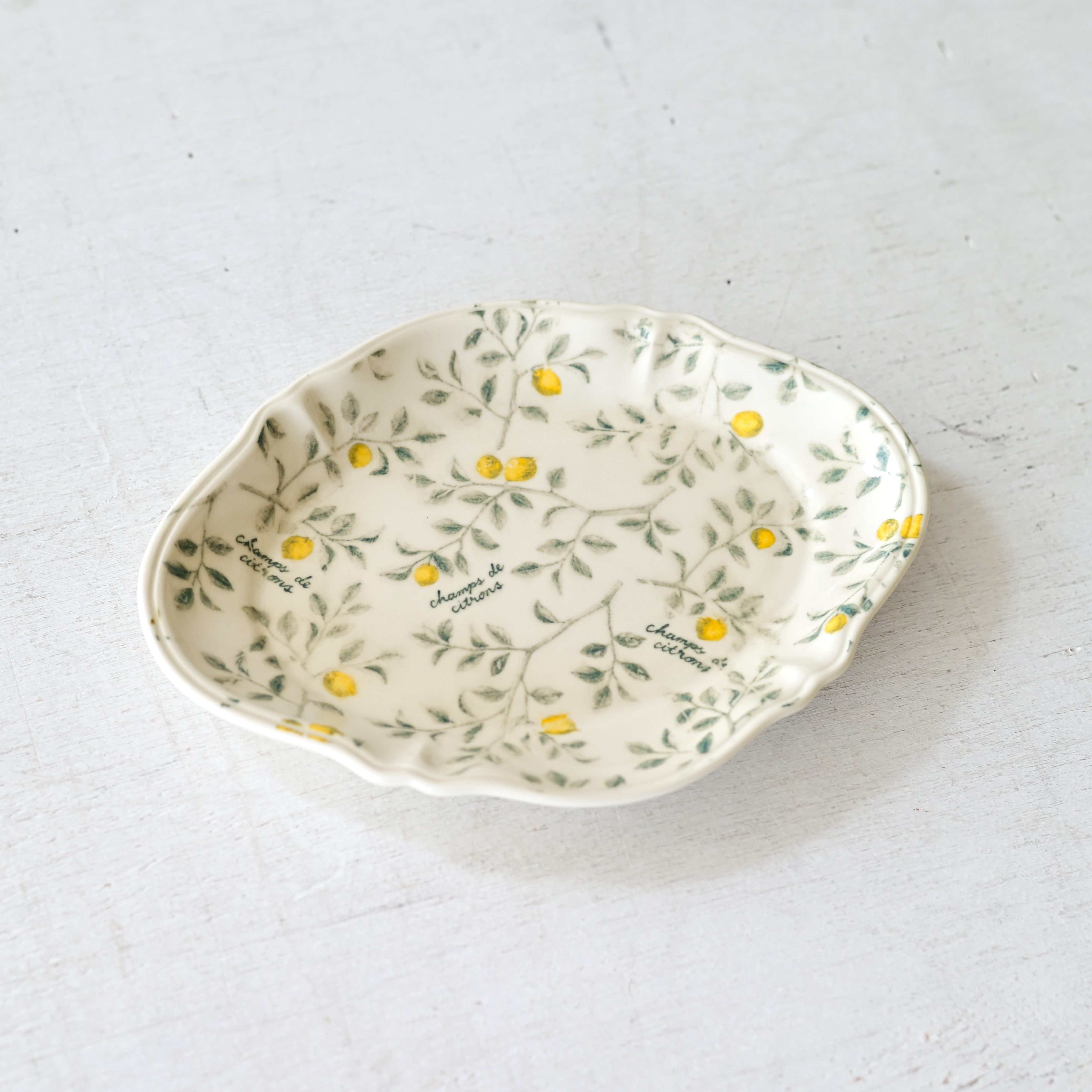 2026年夏の限定商品「ミニャルシトロン」。人気の「ミニャルディーズ/プレートS」に、レモンがたわわに実る畑を想像しながら描いたシトロンの模様を全面に貼り付けた夏らしいアイテム。お菓子を食べる時間を少し特別にしたいという想いから、形は優しく装飾的に。その上に銅版で施されたシトロンの絵付けが上品で可憐な印象です。数量限定生産の今だけの特別なアイテムです。